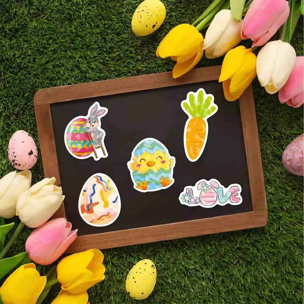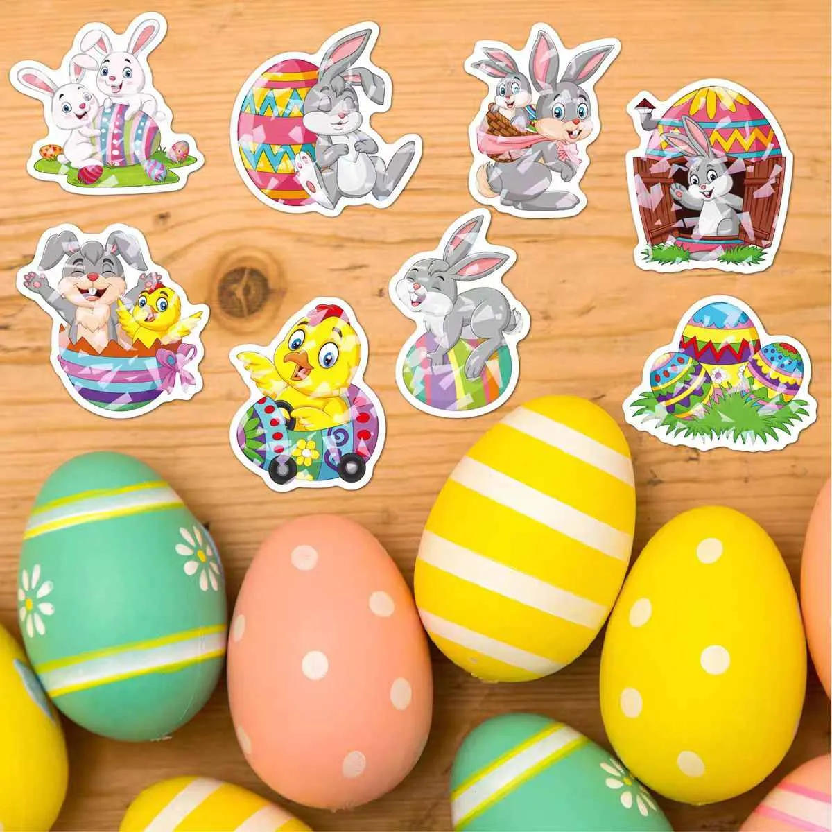 Zamerajte sa na veľkonočné vajíčka s kreatívnym dizajnom vrátane klasických bodiek, kvetinových vzorov, kreslených králikov a štýlov so západnou estetikou. Plnofarebná tlač CMYK prináša jasné pastelové odtiene a prechody pre živý slávnostný vzhľad.