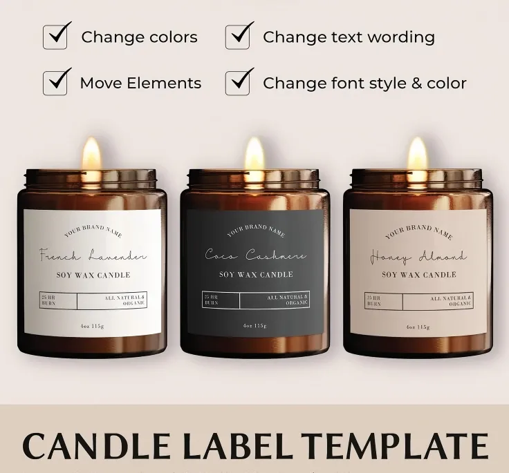 Papier:Cenovo efektívna a ekologická možnosť, ideálna pre rustikálnu alebo minimalistickú estetiku. Funguje dobre so sviečkami zo sójového alebo včelieho vosku zameranými na milovníkov prírodných produktov. Nie je však odolný voči vode, preto sa vyhýbajte priamemu kontaktu s vlhkosťou alebo sviečkovým voskom.