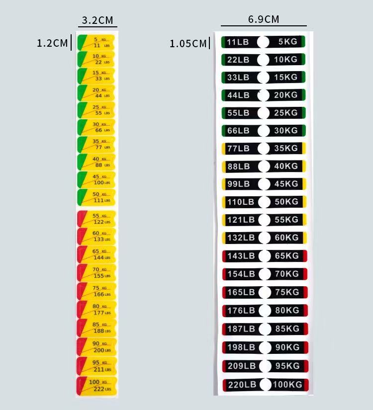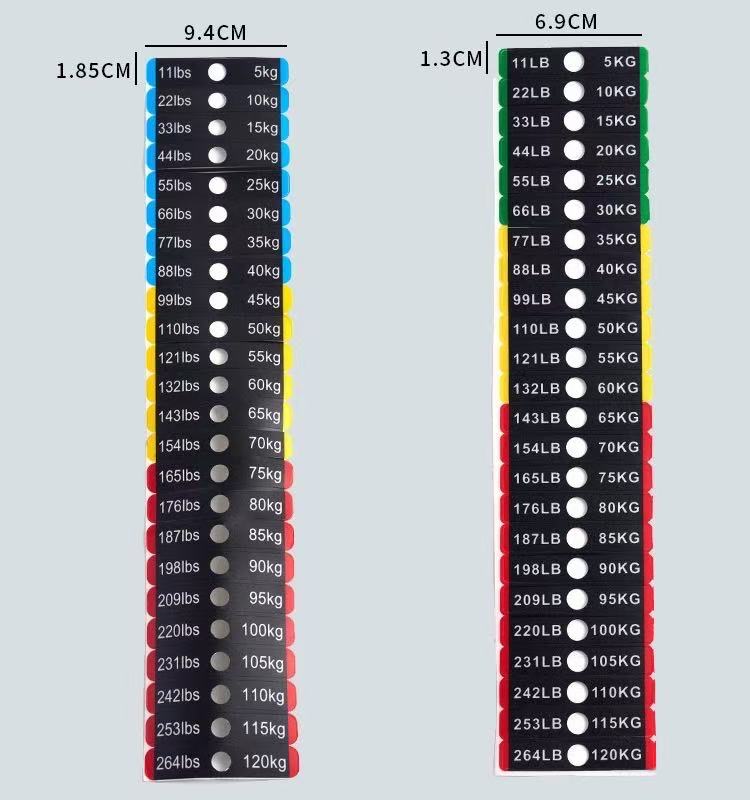 Tieto nálepky so záťažou pre záťažové bloky fitness zariadení sú typom identifikačných nálepiek špeciálne navrhnutých na označovanie hmotnosti fitness zariadení. Zvyčajne sú vyrobené z PVC materiálu a konkrétne rozmery nájdete v tabuľke parametrov produktu. Hodnoty hmotnosti sú jasne vyznačené na nálepkách, čo používateľom umožňuje rýchlo identifikovať a vybrať vhodnú tréningovú hmotnosť.